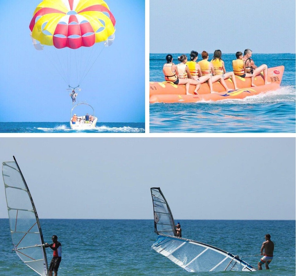 Развлечений в Лазурном множество и на любой вкус. Днем на пляже предлагают прокатится на банане, водных лыжах, таблетке, ощутить прилив адреналина от полета на параплане или парашюте, прикрепленном тросом к катеру. Есть горки для деток, прогулки на лошадях, фото с пиратами и русалками.